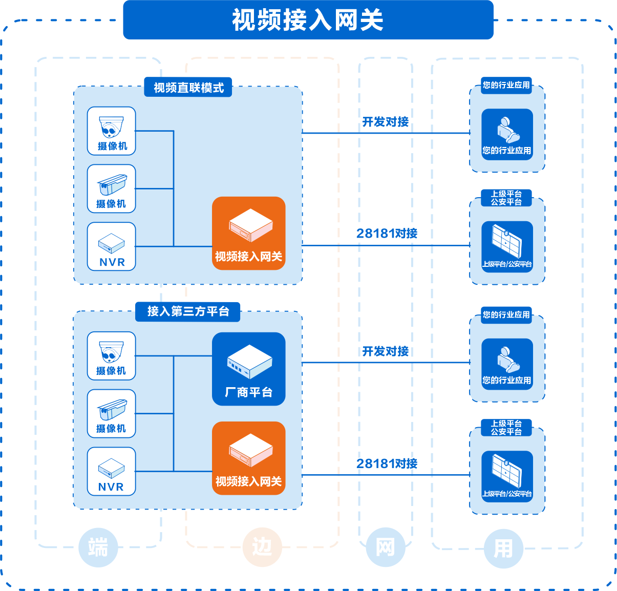 軟硬一體化設備,內置流媒體等軟件,能夠接入幾乎100%的各種視頻監控設備和各個視頻廠商的監控平臺,如海康ISC平臺、大華DSS平臺、華為3800平臺等。產品本身就是一套優秀的微型視頻監控平臺,預覽、回放、錄像、輪詢等功能濟備。另外可配合中臺或者云平臺使用,承擔邊緣側的子域/子網絡的各種視頻設備的接入、轉發。